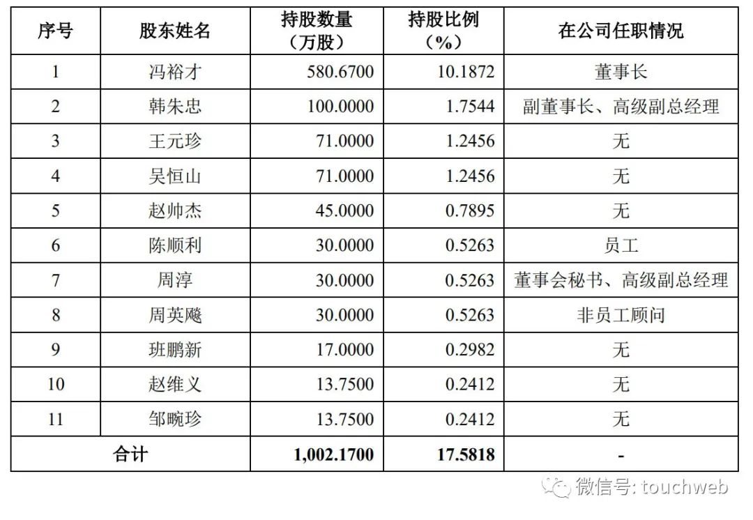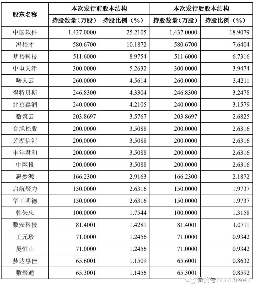 IPO后,中国软件持股为18.9079%,冯裕才直接持股为7.6404%,梦裕科技持股为6.7316%,中电天津持股为3.9474%,曙天云持股为3.4211%,得特贝斯持股为3.2478%,北京鑫润持股为3.1579%,数聚云持股为2.6825%;