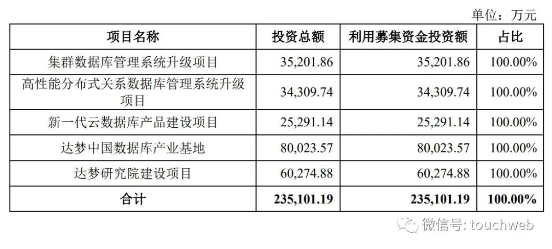达梦数据计划募资23.51亿元。其中,3.52亿元用于集群数据库管理系统升级项目,3.43亿元用于高性能分布式关系数据库管理系统升级项目,2.53亿元用于新一代云数据库产品建设项目,8亿元用于达梦中国数据库产业基地,6亿元用于达梦研究院建设项目。