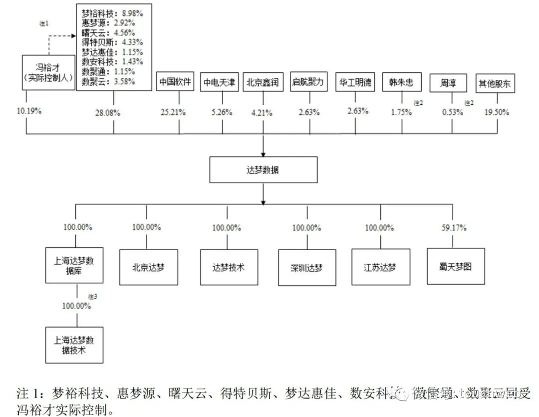 IPO前,冯裕才直接持有10.1872%股份。由冯裕才担任执行事务合伙人并实际控制的梦裕科技、曙天云、得特贝斯、数聚云、惠梦源、数安科技、梦达惠佳、数聚通分别拥有达梦数据8.9754%、4.5614%、4.3304%、3.5767%、2.9163%、1.4281%、1.1509%、1.1456%的表决权,冯裕才通过上述由其实际控制的合伙企业合计控制28.0847%的表决权。