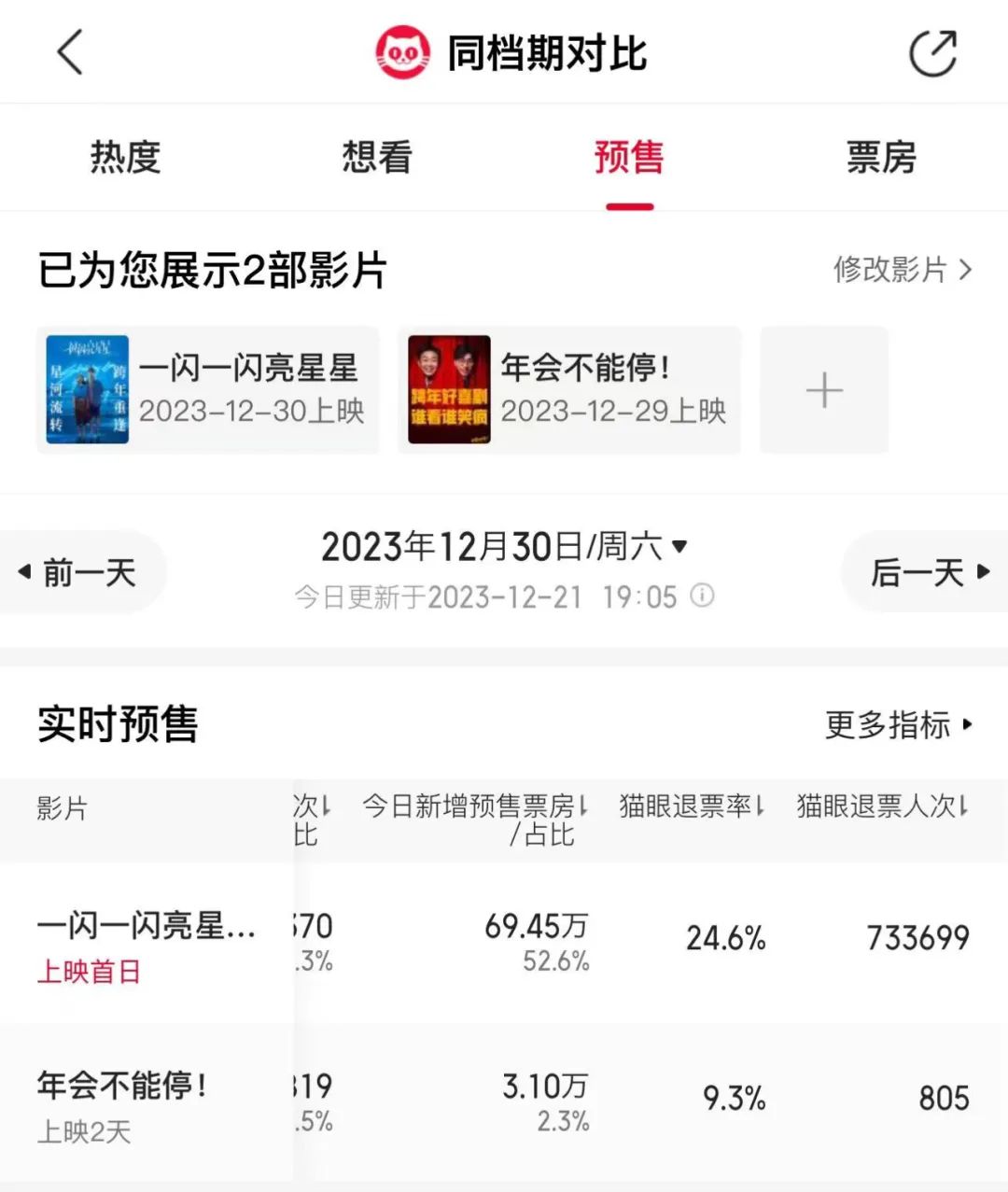 除此以外,由于预售期长达20多天,很多提前购买预售的观众也会由于观影计划变动而改签、退票。对于《一闪一闪亮星星》这部影片而言,预售早既是它领跑于其他同期影片的优势,也成了它的潜在短板。