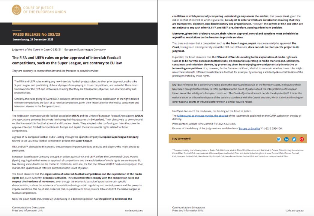 12月21日,欧盟法院官方就国际足联与欧足联涉及垄断欧洲足球一案作出裁决。法院认定,欧足联关于欧超联赛需事先经过批准的规定违反了欧盟法律,同时他们也不能对相应俱乐部进行处罚。