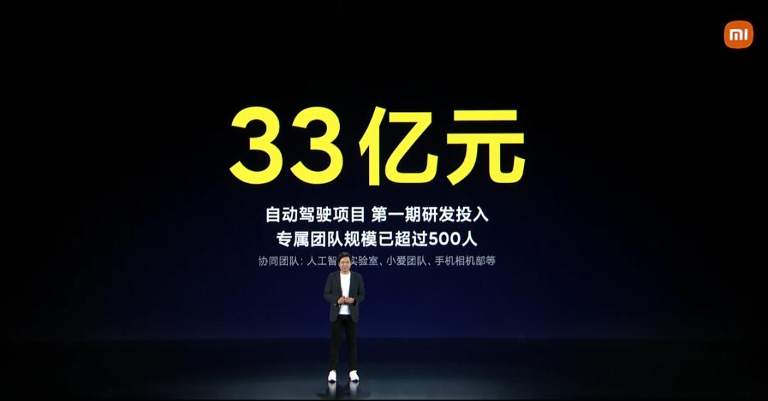 在2022年8月的年度演讲中,雷军称,自动驾驶是汽车工业中最复杂的模块,不仅技术密度高且与安全高度相关,也是小米汽车的第一个突破方向。全力研发自动驾驶技术,目前已组建500人规模的自动驾驶研发团队,首期投入33亿元研发费用,目标是2024年进入自动驾驶行业第一阵营。