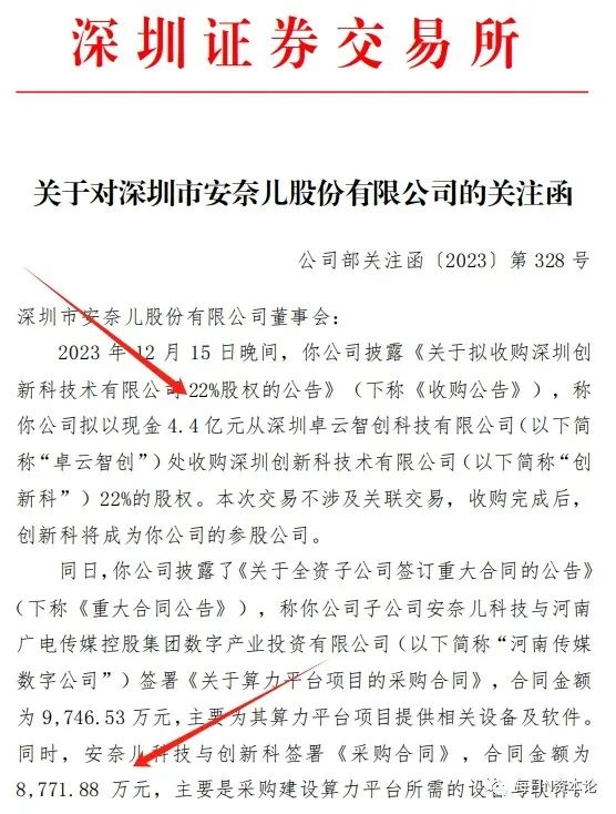 安奈儿的动作也引起了监管部门的关注。深交所很快就对安奈儿下发了关注函,并提出了卓云智创取得创新科股权的对价及估值,是否与本次交易的估值存在重大差异的合理性等十多个问题,要求其在12月22日前报送并对外披露。