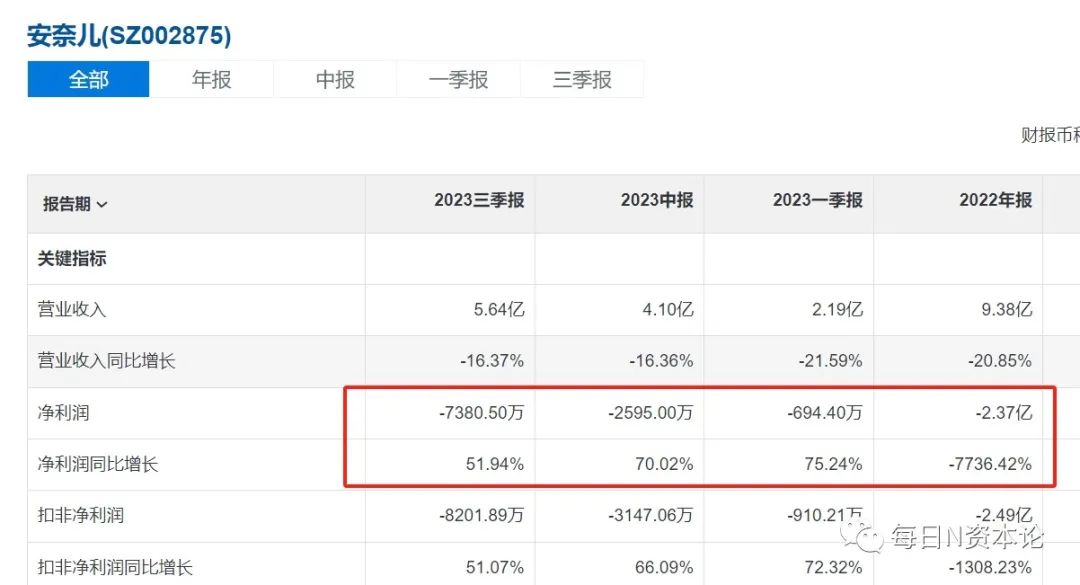 安奈儿2023年三季度财报显示,其营收为5.64亿元,同比下跌16.37%;净利润亏损7380.50万元,同比增长51.97%;扣非净利润亏损8201.89万元。不出意外,2023年年报,安奈儿难逃连续4年亏损。