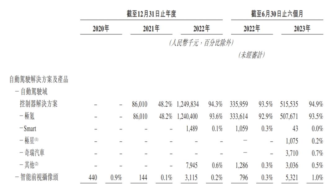 招股书显示,2021年其智能驾驶域控销量仅5796台,到了2022年这个数字激增近8万台,同比增幅12倍,到2023年上半年,其域控产品交付量从上年同期的2.1万台增加至4.2万台。成立至今累计出货量达到13万台,其中绝大部分是基于Mobileye产品为吉利系供货,实际上更像是做代工生意。