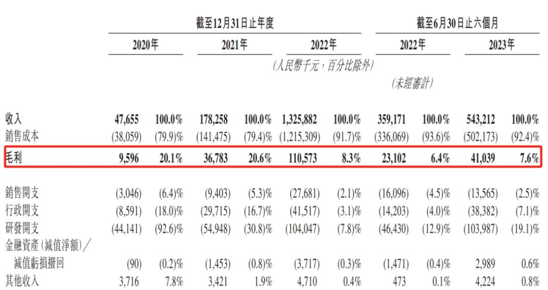数据显示,随着与极氪的业务绑定的越深,知行科技毛利水平持续下跌,从2021年的20.6%,一路降低到去年的8.3%,到今年上半年进一步下跌到7.6%。