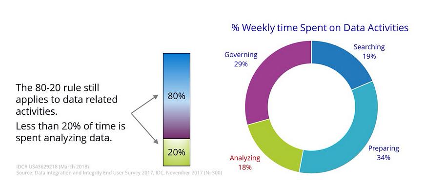 尽管这是来自IDC 博客的旧数据,但这仍然是许多组织的实践场景。许多数据分析师和数据科学家将宝贵的时间花费在搜索和准备数据集上,而不是发现数据集隐藏的潜力。以下是造成此类问题的主要原因: