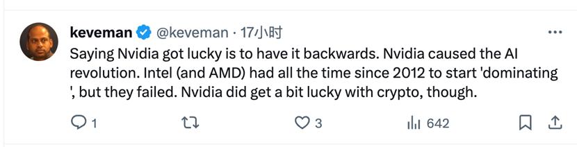 在Keveman看来,说英伟达很幸运,那就是本末倒置了。因为英伟达引发了人工智能革命。自 2012 年以来,英特尔(和 AMD)一直在开始“占据主导地位”,但他们失败了。不过,他认为英伟达在加密货币方面确实有点幸运。