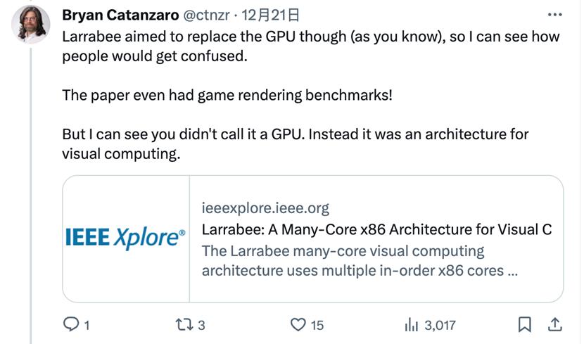 他进一步指出,不过,Larrabee 的目标是取代 GPU(如您所知),这让很多人感到困惑。该论文甚至还有游戏渲染基准!但我可以看到大家没有称其为 GPU。相反,它是一种视觉计算架构。