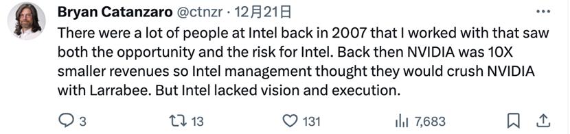 Bryan Catanzaro 接着说:“2007 年,我在英特尔共事过很多人,他们既看到了英特尔的机遇,也看到了风险。当时 NVIDIA 的收入只有现在的十分之一,因此英特尔管理层认为他们会用 Larrabee 碾压 NVIDIA。但英特尔缺乏远见和执行力。”