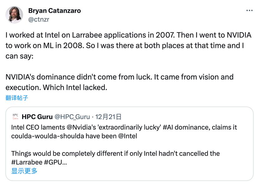 然而,Nvidia 应用深度学习研究副总裁 Bryan Catanzaro 今天早些时候在 Twitter / X 上驳斥了基辛格对人工智能硬件行业现状的激烈看法,称英特尔缺乏在其先前举措中取得成功的愿景和执行力。