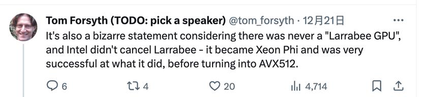 例如有个叫Tom Forsyth的作者表示:“这也是一个奇怪的说法,考虑到从来没有‘Larrabee GPU’,而且英特尔并没有取消 Larrabee - 它变成了 Xeon Phi,并且在变成 AVX512 之前在它所做的事情上非常成功。”