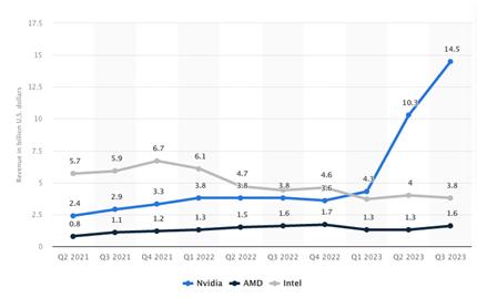 正如上文所说,过去多年以来,英特尔的CPU一直统治着数据中心。但是从下图可以看到,统计Intel、Nvidia和AMD的数据中心市场营收收入,从2022年最后一个季度开始,英伟达就开始实现了对Intel的反超,并在2023年里将英特尔和AMD遥遥甩在身后。(注:参考文章《GPU的历史性时刻》)。