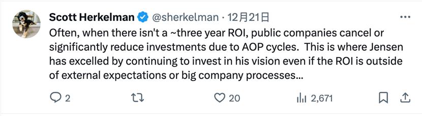 Scott Herkelman也说到:“通常,当没有大约三年的投资回报率时,上市公司会因 AOP 周期而取消或大幅减少投资。这就是 Jensen 的出色之处,即使投资回报率超出外部预期或大公司流程,他也会继续投资于自己的愿景……”