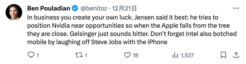 Ben Pouladia更是直言:“在商业上,你创造自己的运气。Jenson说得最好:他试图让英伟达靠近机遇,这样当苹果从树上掉下来时,他们就离机遇很近了。基辛格听起来很酸(bitter)。别忘了英特尔也曾用 iPhone 来嘲笑史蒂夫·乔布斯,从而搞砸了移动业务。“
