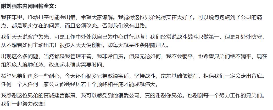 而被这枚“子弹”击中的,还有京东员工们。一周过去,京东员工在公司内网发布了帖子,言辞恳切地讲述了京东运营存在的问题:比如促销机制复杂、大促能动性差、低价心智执行不够到位等。随即刘强东也做出了回应: