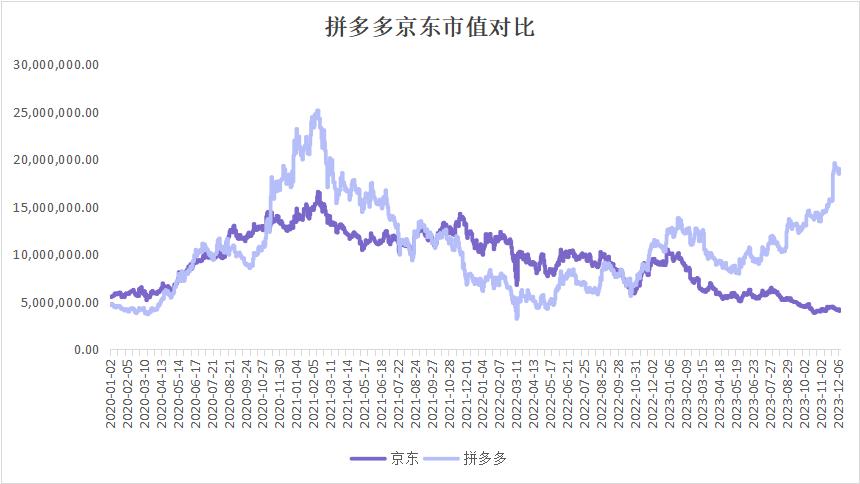 拼多多第一次市值长时间高于京东,是在2021年1月-7月,也是京东处于被动状态的开始。这个时段打败京东的,是拼多多由于新玩法所带来的低价。