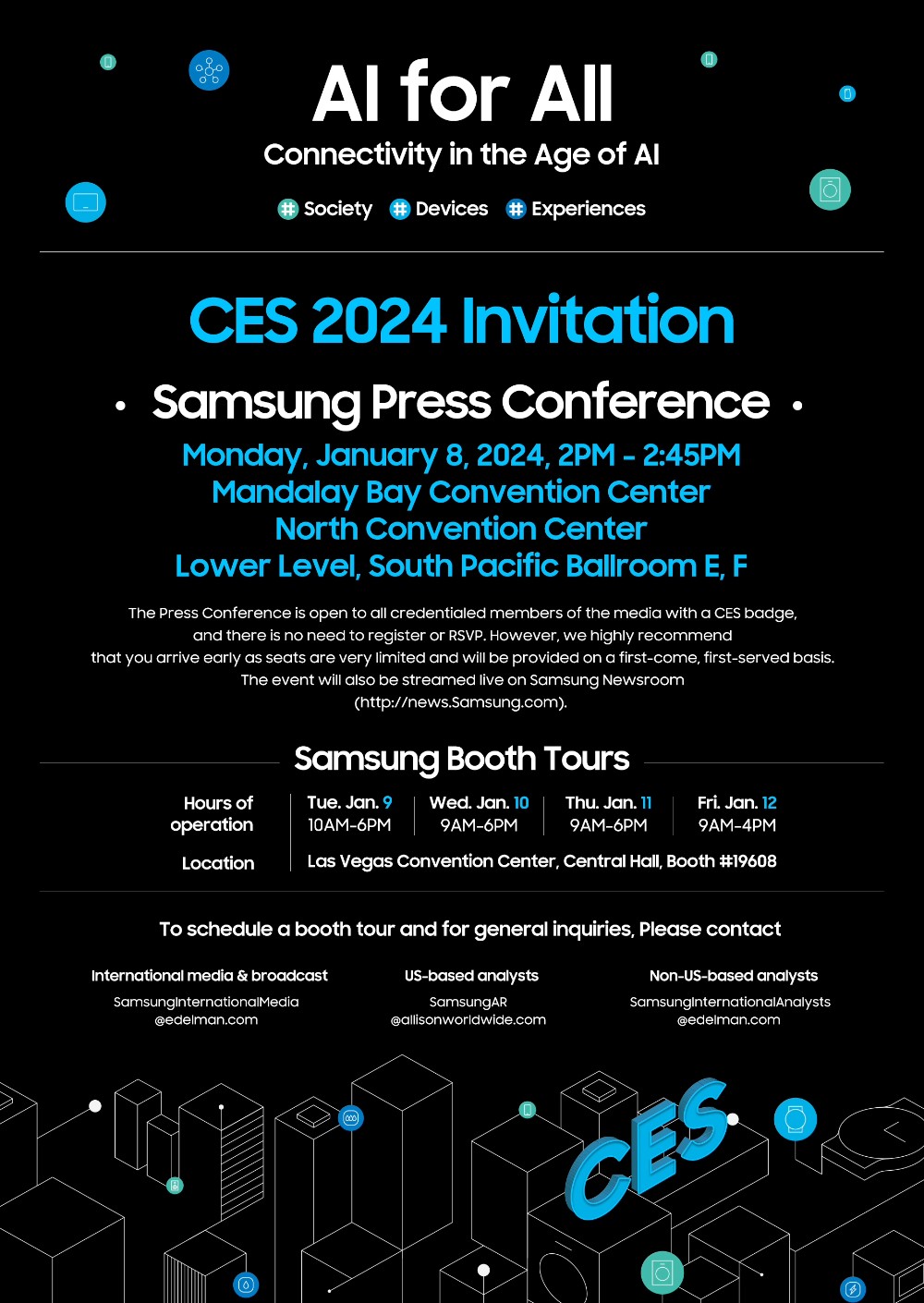 然而不仅是过去一年讨论起来绕不开 AI 的英伟达、AMD、英特尔。早在 12 月初,三星就宣布参加 CES 2024,并计划在开幕前一天举办特别新闻发布会,将由三星副董事长、CEO 兼 DX(移动)部门负责人 Jong-Hee Han 出席主持,更值得关注的是,这场发布会的主题被确定为《AI for All:AI 时代的连接》。