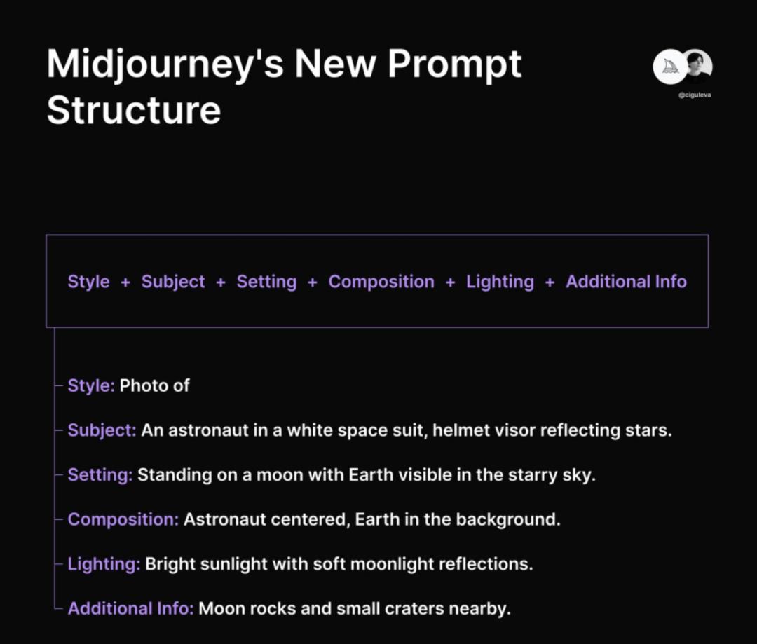 设计师Tatiana Tsiguleva表示,Midjourney V6可以更精准地理解用户的提示指令,而这也意味着无需再输入那些奇怪的短语或单词,比如写tag、photorealistic、4k之类的。下面是一个基于典型语言框架设计的简单结构: