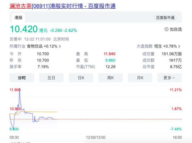 12月22日,澜沧古茶登陆港交所,发行价每股10.7港元。截至发稿,澜沧古茶跌2.62%,报10.42港元,市值8.75亿。