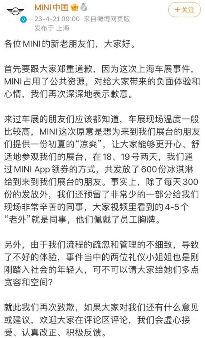 如此双标的行为,让众网友愤愤不已,大家纷纷指责工作人员“崇洋媚外”、“不尊重中国人”,让宝马站出来道歉。宝马MINI倒是很听话地出来回应了,但其第一次发布的致歉声明,简短不足120字,被网友评价成“不如AI写的”、“史诗级的拉胯公关”。