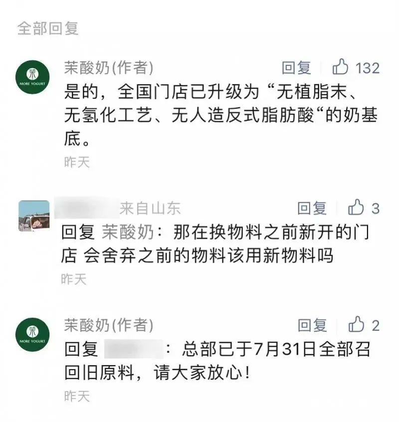 然而到了8月份,茉酸奶又宣布,全国门店于8月1日起升级全新版本奶基底,无植脂末、无氢化工艺、无人造反式脂肪酸,同时还表示总部已于7月31日全部召回旧原料。不少消费者认为,这波操作是变相承认了此前产品中含有植脂末。