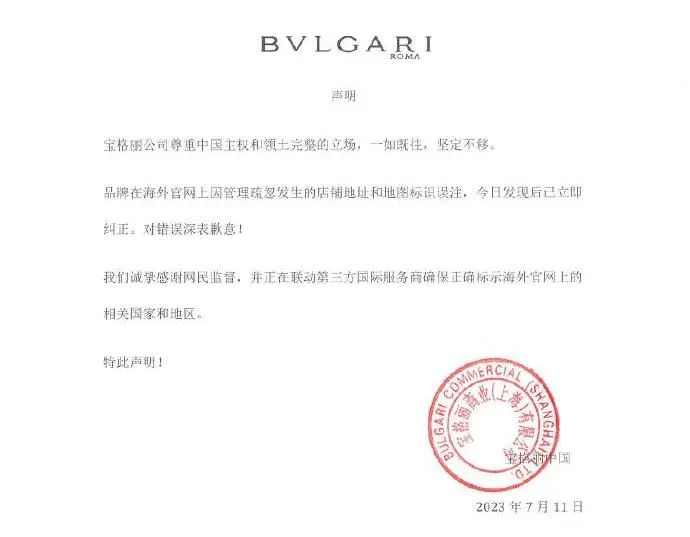 尽管官方在7月11日发布了声明,称“公司尊重中国主权和领土完整”,对“官网上因管理疏忽发生的店铺店址和地图标识误注”致歉,但由于宝格丽并没有在海外平台同步该信息,网友们并不买账。人民日报也对此评论称:宝格丽道歉别弄成专供中国大陆。中国一点都不能少!