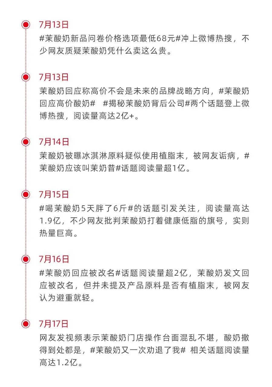 7月13-16日,茉酸奶接连登上热搜,网友们纷纷围绕“茉酸奶新出产品定价最低68元”、“茉酸奶应该叫茉奶昔”、“喝茉酸奶5天胖了6斤”等话题展开讨论。其中,争议最大的不仅是其高昂的售价,还有疑似使用“植脂末”等不健康原料的问题。