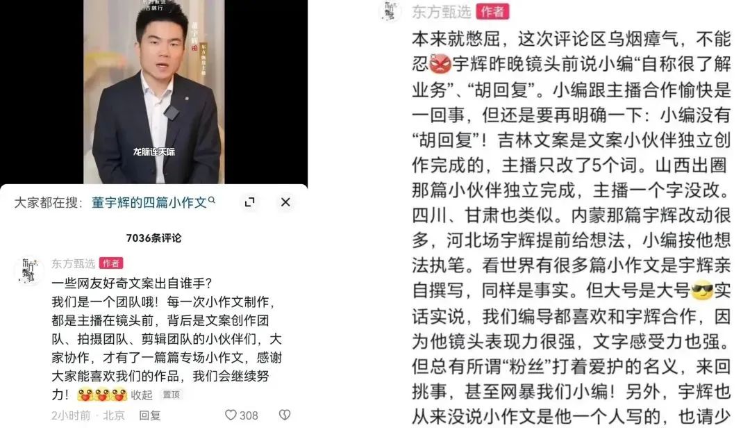 随后,东方甄选CEO孙东旭、董宇辉本人乃至俞敏洪都纷纷下场回应此事。尽管他们也都解释了小作文的创作由主播以及文案团队合作完成,但由于东方甄选小编自称“憋屈”,加上孙东旭透露董宇辉年薪、直播间摔手机等举动,以及另一个主播天权在直播间挑衅观众等行为,事件反而进一步升级。