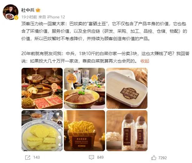 2月20日,有网友吐槽巴奴火锅出售“天价土豆”,18元一份的富硒土豆只有5片。尽管官方解释称是个误会,其实是半份且只卖9元,但很多网友还是认为,所谓的富硒土豆定价过高。偏偏此时巴奴创始人杜中兵又站出来表示“暂时不考虑降价”,这让很多人认为巴奴“态度傲慢”。
