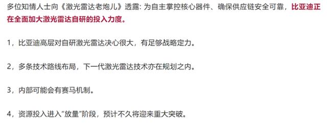 另一个信息是,今年3月有媒体爆料:为自主掌控核心部件、确保供应链安全可靠,比亚迪正在全面加大激光雷达的自研投入力度。