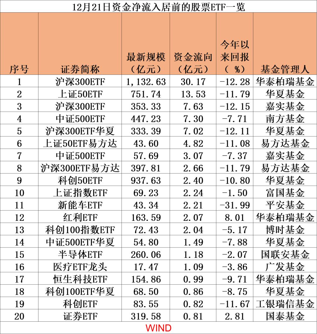 记者注意到,不少大型基金公司旗下ETF净流入明显。12月21日数据显示,头部基金公司易方达整体资金净流入6亿元,两大宽基ETF强悍吸金,如易方达上证50ETF和易方达沪深300ETF分别净流入4.8亿元、2.7亿元。