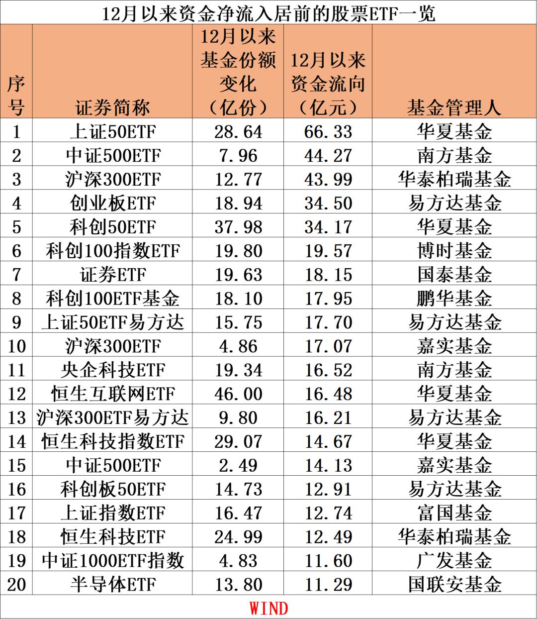 从本月资金净流入居前的单个股票ETF来看,WIND数据显示,截至12月21日,华夏上证50ETF12月以来基金份额增加了28.64亿份,资金净流入达66.33亿元,成为“吸金”王。紧随其后的南方中证500ETF、华泰柏瑞沪深300ETF12月以来资金净流入均在43亿元以上。此外,易方达创业板ETF、华夏科创50ETF本月以来也录得超34亿元的资金流入。