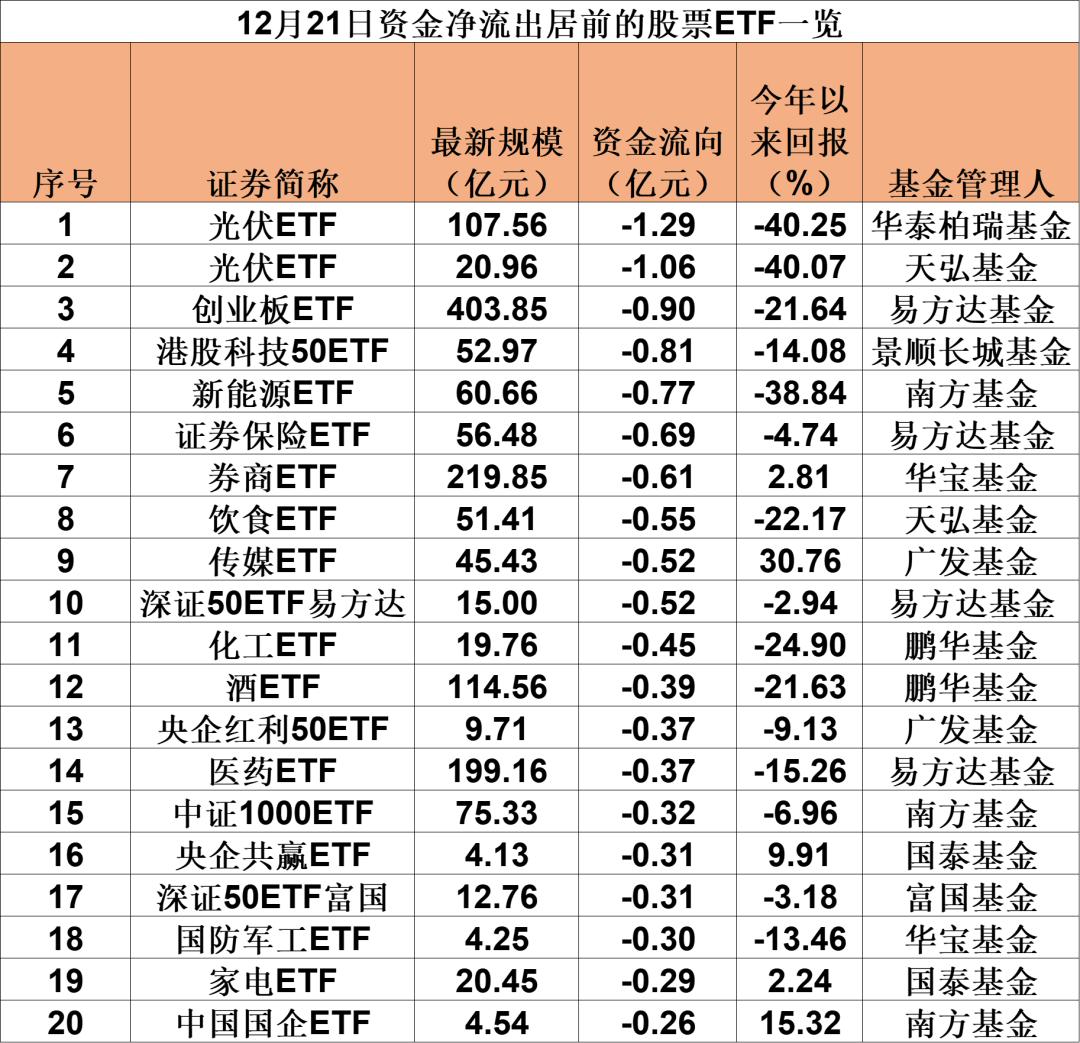 从资金净流出排行看,12月21日,新能源、证券保险、饮食、传媒等热门细分赛道ETF产品占据主力,此外,个别中证1000ETF、深证50ETF当日资金净流出同样居前。其中,华泰柏瑞光伏ETF单日资金净流出最多,达1.29亿元。紧随其后的是天弘光伏ETF单日“失血”超1.06亿元。