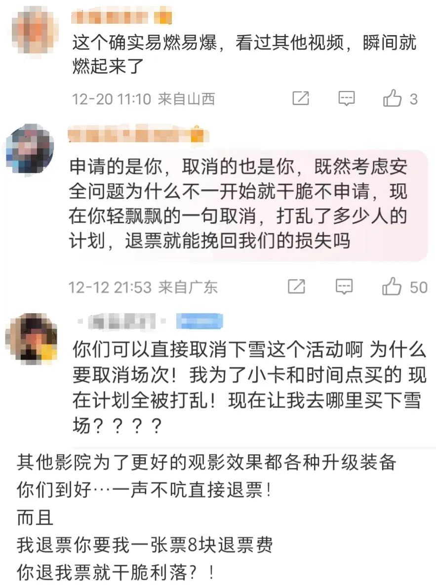 万象影城方面在评论区回复称:“喷雪机在室外比较出效果,在室内就比较尴尬,还是要考虑大家的安全问题。”“我们会正常排映《一闪一闪亮星星》,需要您重新购票。”