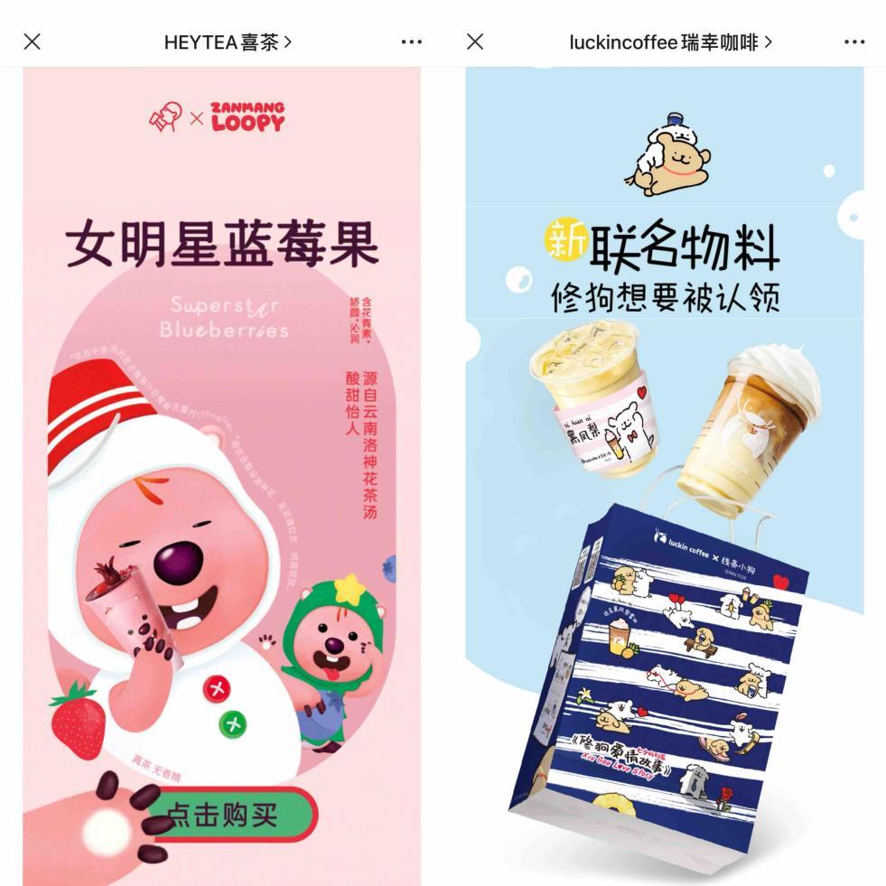 今年茶饮品牌就选择了不少卡通IP联名,包括被称为“顶流”的粉色小海狸loopy、多次刷屏的线条小狗等等。这些IP在社交媒体上备受年轻人追捧,有不少愿意收集各种与之相关商品的忠实粉丝,品牌选择与其联名,合作消息一传出就会有不少“自来水”营销。