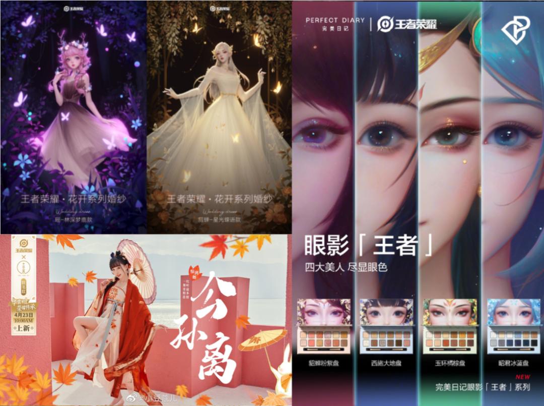 2021年,王者荣耀与高定婚纱品牌WECOUTURE联名推出婚纱,公布当天相关话题就登上了微博热搜TOP4,后续话题总阅读超4亿。2022年,汉服品牌十三余与王者荣耀联名推出了29款产品,多个爆款被称为是“真人版皮肤”;美妆品牌完美日记也与之合作推出了眼影盘,形成游戏妆造话题风潮。