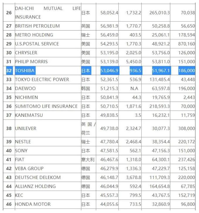 甚至到了 1996 年,东芝还以 530 亿美元的营收高居世界财富 500 强榜单中的 32 位。