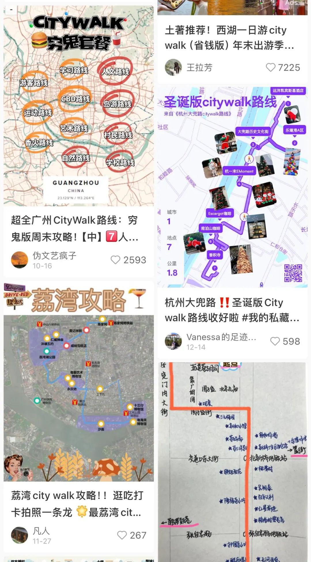 其次,Citywalk自带主题性,背后实际上是一条新零售、餐饮、休闲娱乐结合的消费动线结合,容易形成圈层聚集。比如人气路线中,人文历史、美食探店、户外骑行等路线主题,可以吸引特定属性的群体。如果可以把握更为细分化的Citywalk人群标签,品牌就可以抓住目标群体特质,更有方向性地进行营销活动。