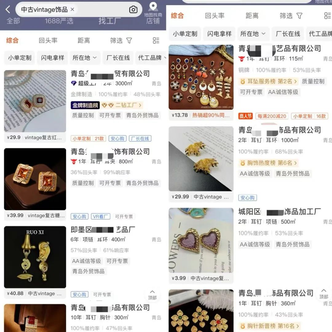 在线上批发平台上搜索“中古首饰”或“vintage首饰”,率先跳出的厂家所在地大多是青岛城阳。