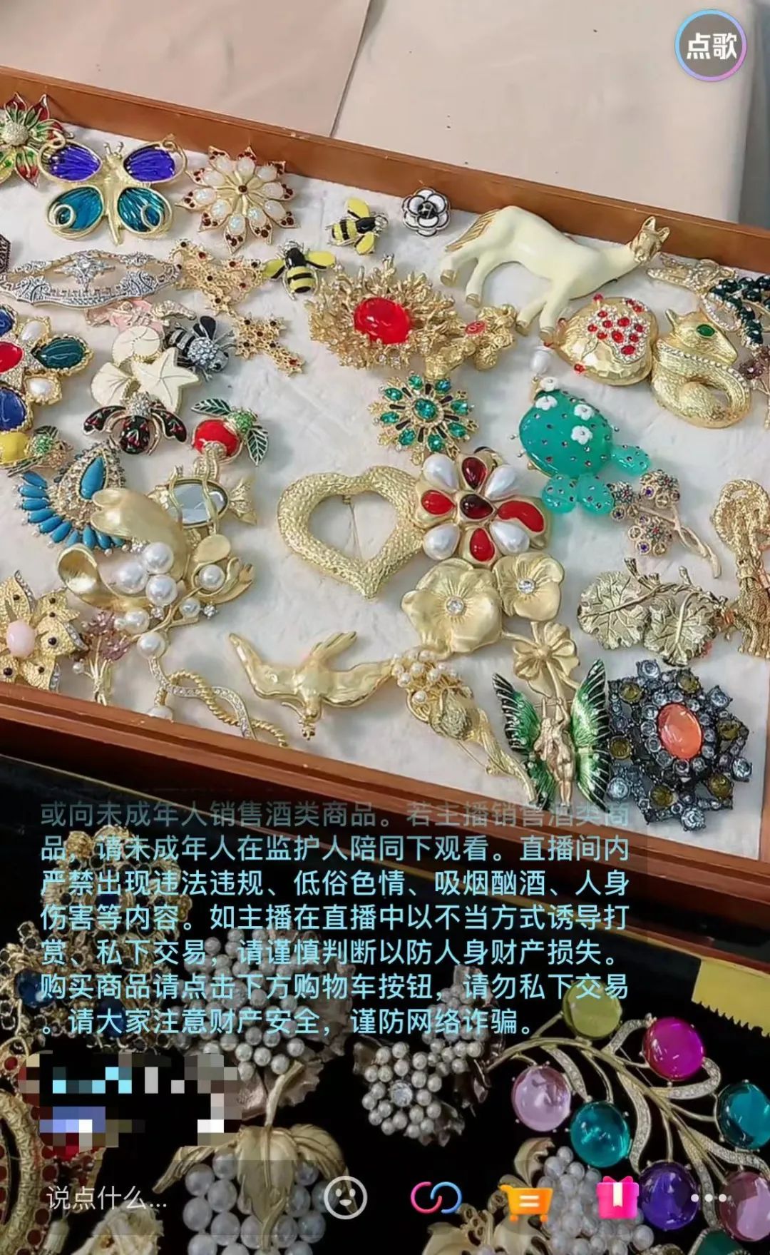 闪瞎人眼的珠宝首饰堆满了屏幕,各种夸张的风格都能在这些直播间里看到。(图/直播截图)