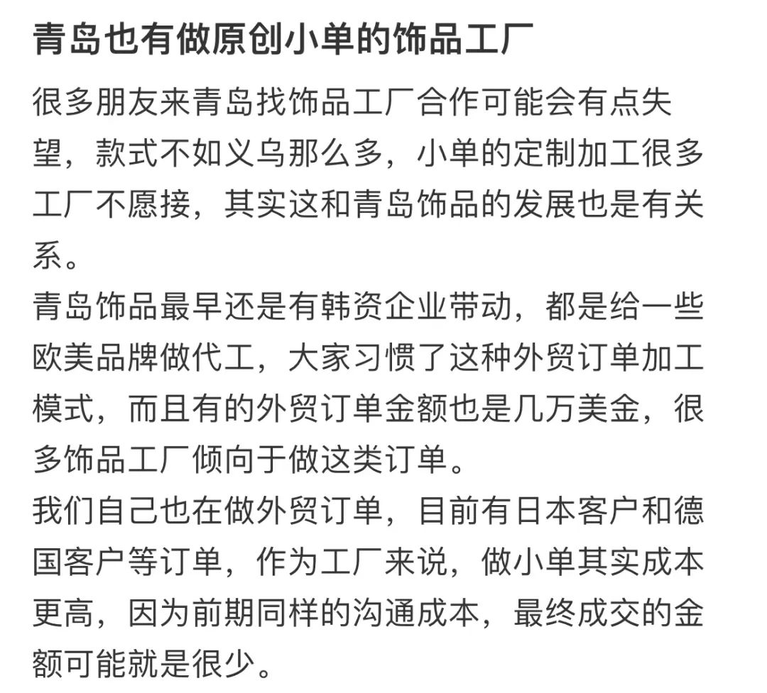 越来越多的青岛人涌入饰品行业,据一位在即墨区长大的年轻网友回忆:“从小妈妈就在工厂做手工,村里也有接手工活的作坊,大部分产品都是出口的。”