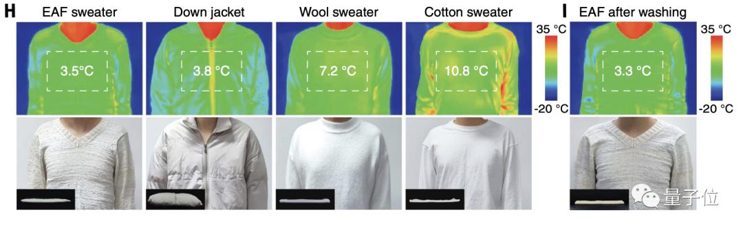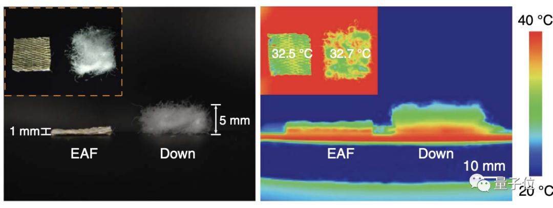 研究者接着又把EAF和羽绒进行了对比,结果是两者的保温效果接近,但EAF的厚度仅为羽绒的1/5。