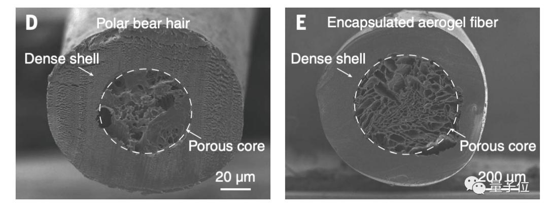 他们观察了北极熊毛发的电镜照片,发现它是一种两层结构,外层是致密的壳,内部则是疏松多孔的构造。