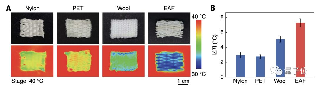 首先,研究人员测试了EAF未被加工成毛衣时的保温性能,并与常见的尼龙、涤纶(PET)、羊毛三种材料进行了对比。