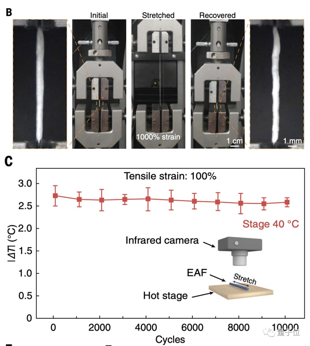 并且这种拉伸不会造成保温性能的损失,研究人员对EAF材料反复拉伸到10倍长度,重复一万次后温度并未发生明显变化。