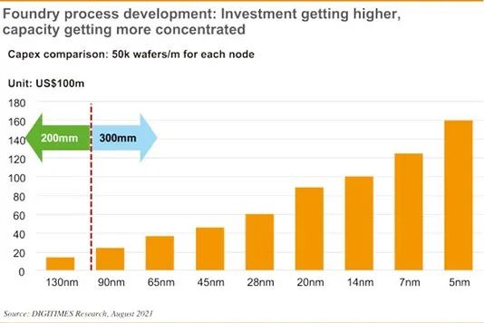 根据Digitimes在一篇文章中预估,如下图所示,一座每月可生产 50000 片90 纳米晶圆的12 英寸晶圆厂耗资约为 24 亿美元。一旦推进到 28 纳米,同等规格晶圆厂的成本将达到 60 亿美元, 5 纳米晶圆厂的成本更是高达 160 亿美元。