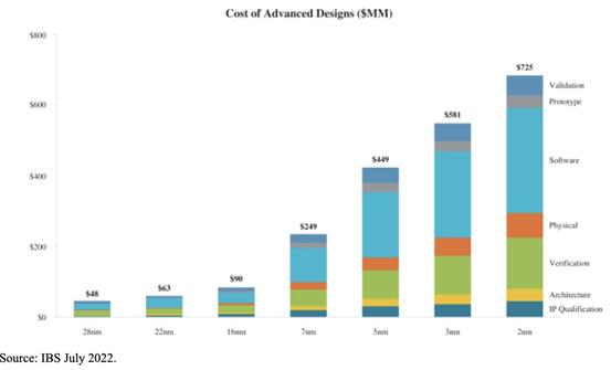 正因为拥有如此多步骤,可以预见芯片设计过程中需要涉及多少的工具和软件之前,IBS有一张图广为流行。如下图所示,展示了不同节点下生产一颗新芯片的成本。从这个图中我们可以看到,芯片设计成本不但包括了各种IP的授权费用,还包括了软件和验证带来的支出。如图所示,在5nm的时候,芯片的设计成本已经高达5.4亿美元。