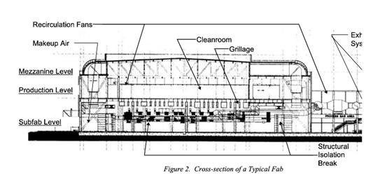 首先看建厂方面,一般而言,晶圆厂的建筑负责保护芯片产线免受周围环境的影响。金孤雁的核心是洁净室,里面装有生产新芯片的机器。晶圆厂的其余部分负责尽可能地将洁净室与外界环境隔离。下图提供了铸造厂的横截面图。请注意,因为我们需要大量的结构隔离工作来稳定包含洁净室的生产水平,所以这部分的建设工作最终可能成为整个主题结构中最昂贵的部分。