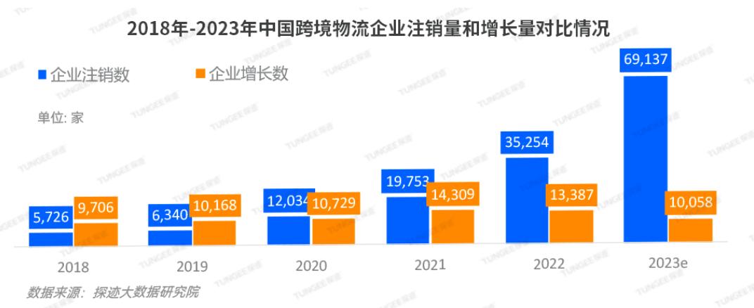 不过,虽然跨境物流前景广阔,但不确定性较强,不少跨境物流企业也因为“不堪重负”,不得不退出竞争。探迹大数据研究院数据显示,跨境物流企业注销数量持续增加,在2023年出现了注销峰值,达到69137家。